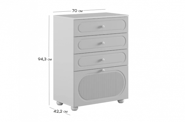Корпус комода выполнен из ЛДСП толщиной 16 мм, фасады изготовлены из МДФ в плёнке ПВХ. Фасады с фрезеровкой подчёркивают аккуратный внешний вид изделия. Оригинальные круглые ручки и опоры придают комоду современный и лёгкий характер, делая его гармоничной частью детского интерьера.