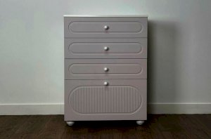 Комод оснащён тремя выкатными ящиками на шариковых направляющих, обеспечивающими плавный и надёжный ход. Ящики подойдут для хранения одежды, белья, аксессуаров или игрушек. В нижней части расположена вместительная откидная секция, предназначенная для более габаритных предметов и сезонных вещей.
