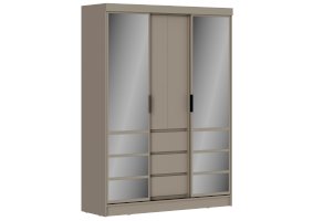 Комбинированный дизайн: Шкаф сочетает в себе раздвижные двери-купе по бокам и распашные фасады с выдвижными ящиками в центре.